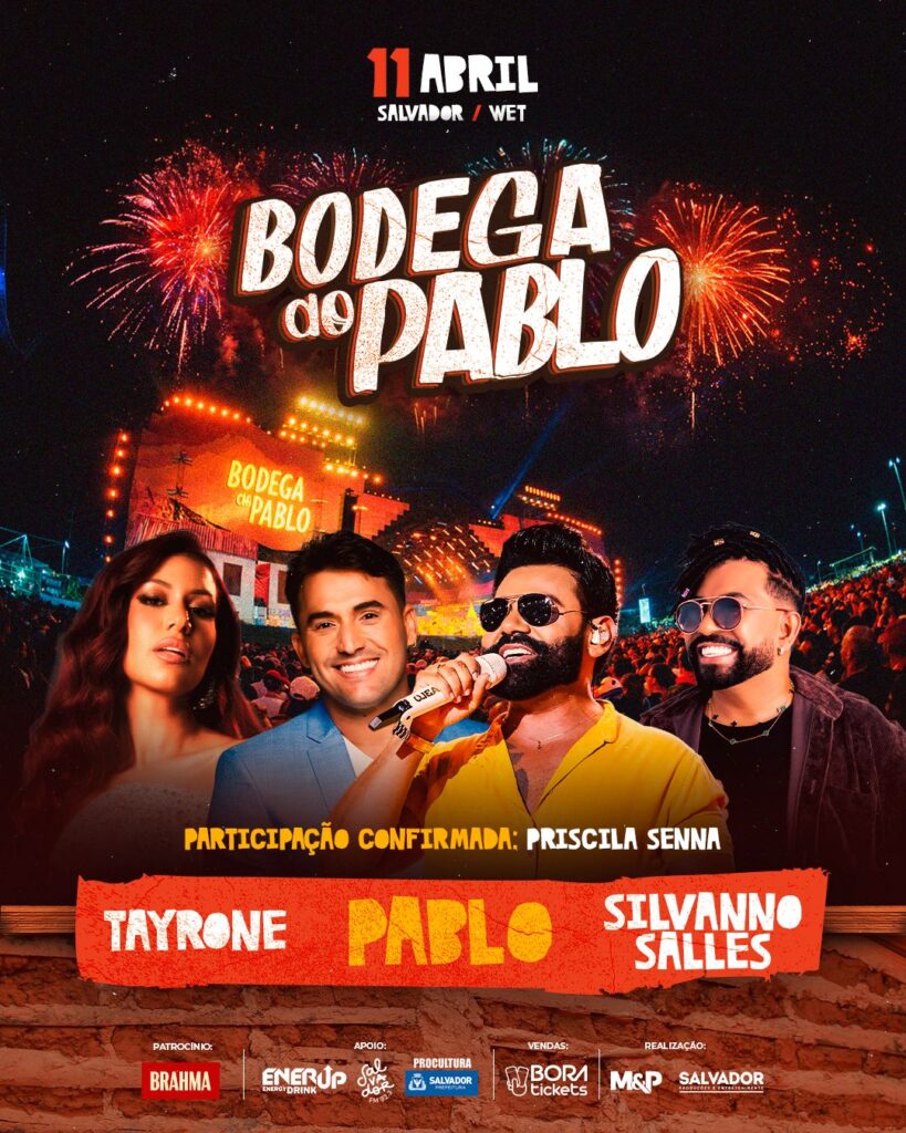 Além de Pablo, a ‘Bodega’ contará ainda com shows de Silvanno Salles e Tayrone, que estarão juntos com Pablo depois de 10 anos no mesmo palco. Os três ícones do arrocha vão apresentar uma noite cheia de hits e muita sofrência. Com ambientes que remetem à energia das ‘bodegas’ de interior, onde histórias são vividas e momentos são marcados, o evento contará com um palco temático e diversos ambientes instagramáveis, tudo pensado para fazer com que o público viva uma imersão durante a festa.
