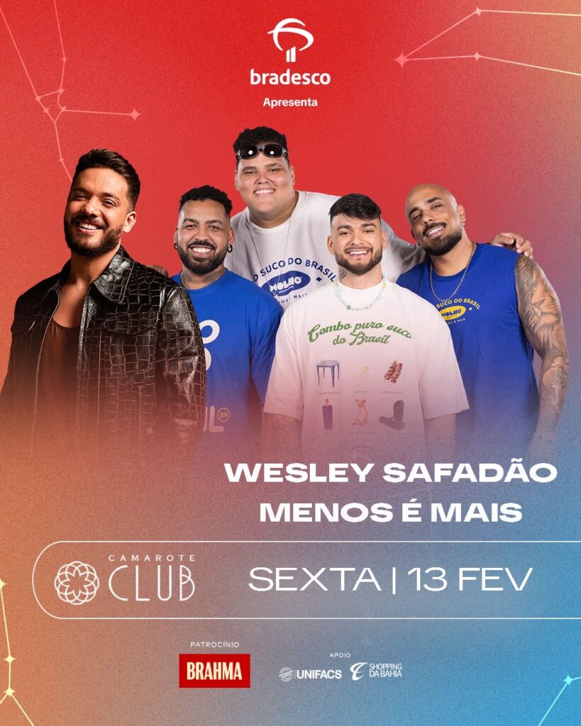 Além de Wesley Safadão e Menos É Mais, o Camarote Club receberá também Henry Freitas, Natanzinho Lima e Felipe Amorim (quinta-feira), a dupla Matheus & Kauan e o som percussivo da Timbalada (sábado), as batidas eletrônicas de Alok e o carisma de Claudia Leitte (domingo), o pagode contagiante de Xanddy Harmonia, o balanssu da Filhos de Jorge e o romantismo de Thiaguinho (segunda-feira) e, encerrando a folia, na terça-feira GG Léo Santana, Sorriso Maroto e Alexandre Peixe com o projeto Axézin.