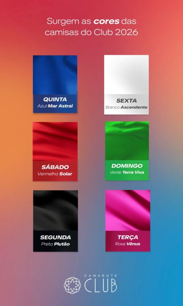 O espaço, que chega em 2026 comemorando 8 anos de existência e de sucesso, acabou de divulgar as cores oficiais dos abadás para os 6 dias de festa. Unindo toda a magia emblemática do cosmo e dos signos, com sofisticação e alegria da maior festa popular do planeta, o Club promete marcar a memória dos foliões.