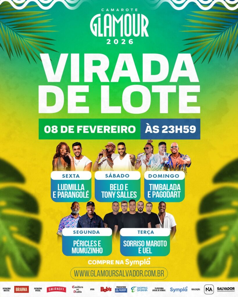 O toque de Glamour vai invadir o Carnaval de Salvador em 2026, o Camarote Glamour anunciou virada de lote que será dia 08 de fevereiro, com novos preços em vigor no dia 09 de fevereiro. O espaço levará para o circuito Barra/Ondina, além de um super serviço open bar, grandes atrações do cenário musical, para oferecer ao folião 5 intensos dias de muita festa.