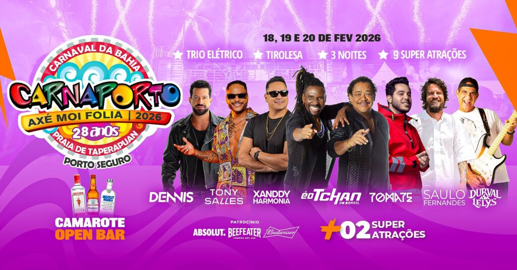 O Carnaporto Axé Moi 2026 acontecerá nos dias 18, 19 e 20 de fevereiro de 2026 na Arena Axé Moi, em Porto Seguro – Bahia, e você não pode ficar de fora!