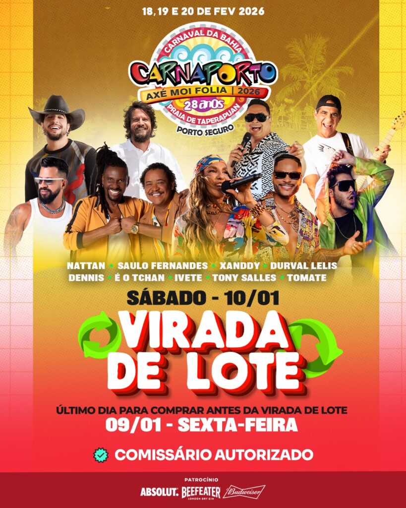 Dia 10 de janeiro acontece a quinta virada de lote do Carnaporto Axé Moi 2026. Você tem até o dia 9 de janeiropara garantir o seu no valor do lote atual.