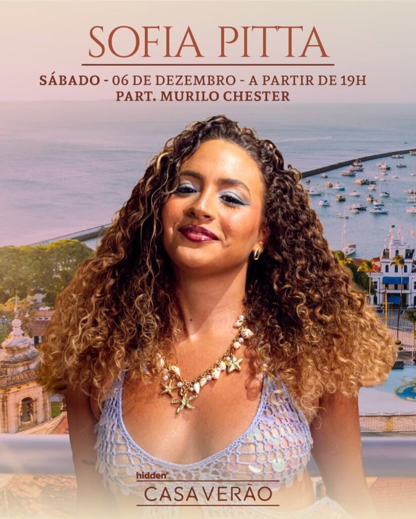 A cantora e compositora Sofia Pitta se apresenta neste sábado (06) na Casa Verão Hidden, no Centro Histórico de Salvador, com o show “Suingue e Maresia”. A apresentação começa às 19h, trazendo a atmosfera tropical, dançante e afetiva que marca o trabalho da artista.